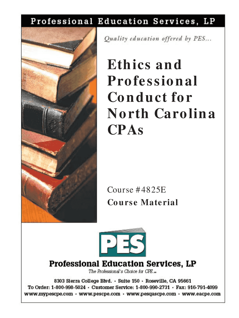 Ethics and Professional Conduct for North Carolina Discourse #4825E Course Materialities AND PROFESSIONAL CONDUCT FOR NORTH CAROLINA CPA (COURSE #4825E) TABLE OF CONTENTS Page Introduction Chapter