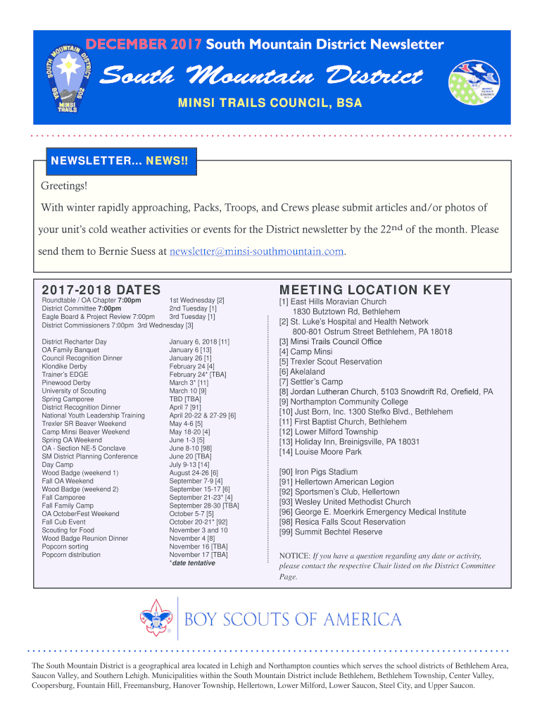 DECEMBER 2017 South Mountain District Newsletter South Mountain District MINI TRAILS COUNCIL, NEWSLETTER... NEWS!! Greetings! With winter rapidly approaching, Packs, Troops, and Crews please submit