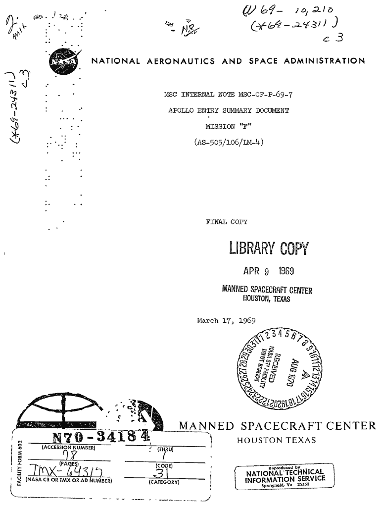 (JJ TOF i .... .....1 OJ :J. / ()(7((/1.;L '/i!, J))c.3 NATIONAL AERONAUTICS AND SPACE ADMINISTRATION. 'MSC INTERNAL NOTE MSCCFP697. 'APOLLO ENTRY SUMMARY DOCUMENTMISSION “F “., .(AS505!106!LM4)FINAL