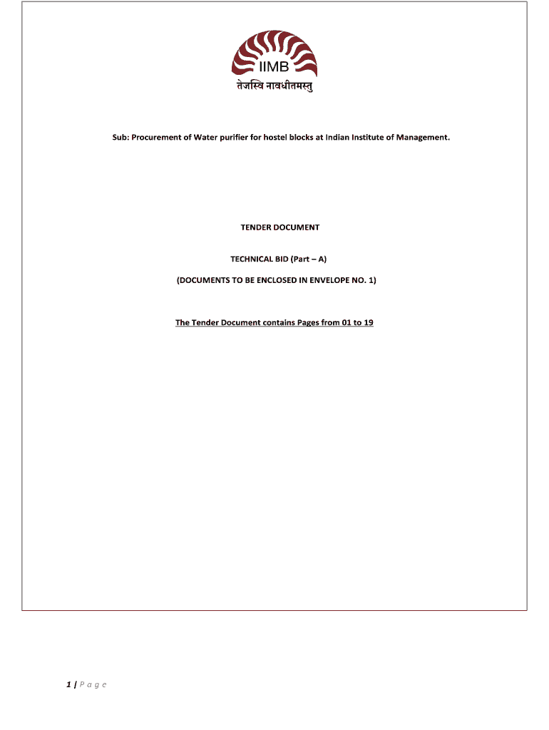 Sub: Procurement of Water purifier for hostel blocks at Indian Institute of Management. TENDER DOCUMENTTECHNICAL BID (Part A) (DOCUMENTS TO BE ENCLOSED IN ENVELOPE NO. 1)The Tender Document contains