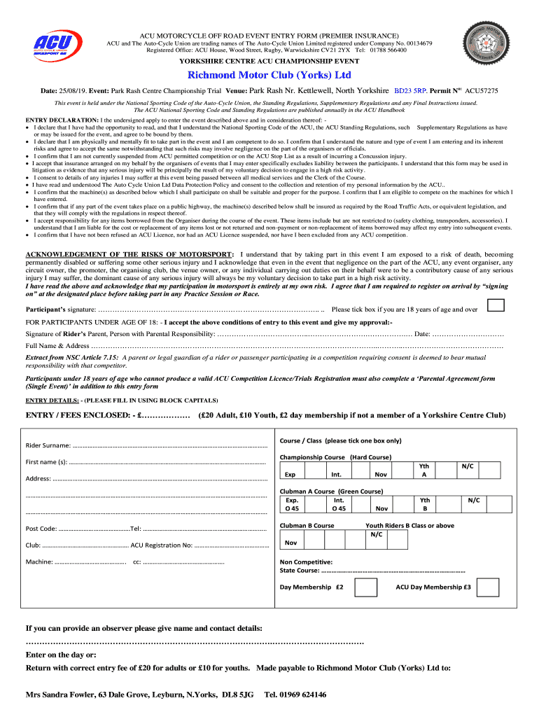 ACU MOTORCYCLE OFF ROAD EVENT ENTRY FORM (PREMIER INSURANCE)