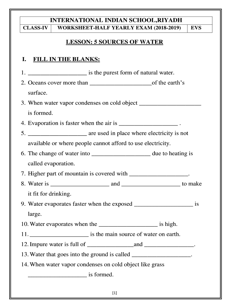 INTERNATIONAL INDIAN SCHOOL, RIYADH CLASSIVWORKSHEETHALF YEARLY EXAM (20182019)LESSON: 5 SOURCES OF WATER I.FILL IN THE BLANKS:1. Is the purest form of natural water. 2. Oceans cover more than of