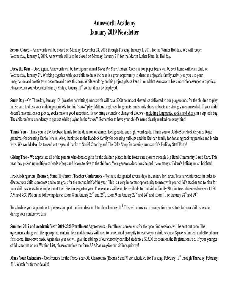 Ainsworth Academy January 2019 Newsletter School Closed Ainsworth will be closed on Monday, December 24, 2018, through Tuesday, January 1, 2019, for the Winter Holiday. We will reopen Wednesday, January