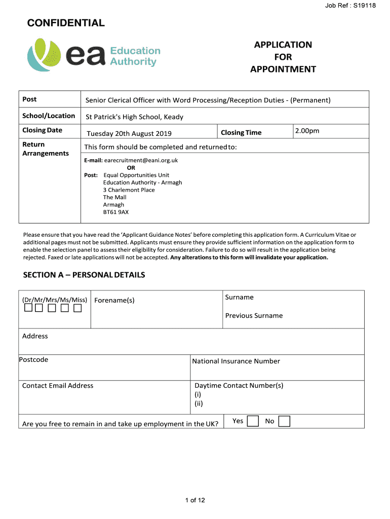 Job Ref : S19118CONFIDENTIAL APPLICATION FOR APPOINTMENT PostSenior Clerical Officer with Word Processing/Reception Duties (Permanent)School/Locations Patrick's High School, KeadyClosing Date Tuesday
