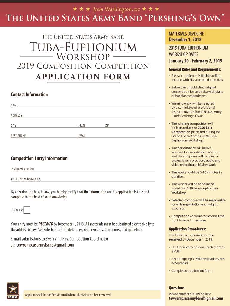 H H H from Washington, DC HH The United States Army Band Pershing's Own The United States Army BandTubaEuphonium Workshop2019 Composition Competition P L I C AT I O N F O RM MATERIALS DEADLINE December