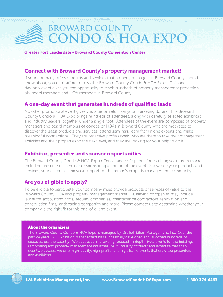 BROWARD COUNTYCONDO & HOA EXPO Greater Fort Lauderdale Broward County Convention Interconnect with Broward Counties property management market! Day only event gives you the opportunity to reach hundreds