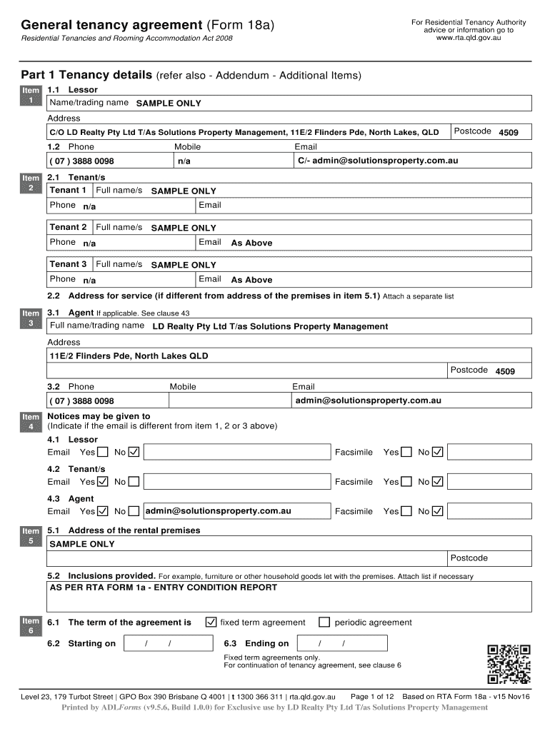 For Residential Tenancy Authority advice or information go to www.rta.qld.gov.auGeneral tenancy agreement (Form 18a) Residential Tenancies and Rooming Accommodation Act 2008Part 1 Tenancy details