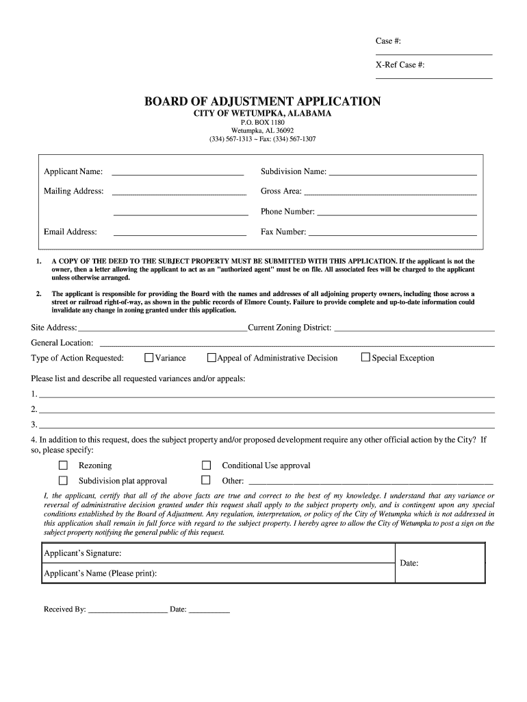 Case #: Xref Case #:BOARD OF ADJUSTMENT APPLICATION CITY OF WETUMPKA, ALABAMA P.O. BOX 1180 Wetumpka, AL 36092 (334) 5671313 Fax: (334) 5671307Applicant Name:Subdivision Name:Mailing Address:Gross