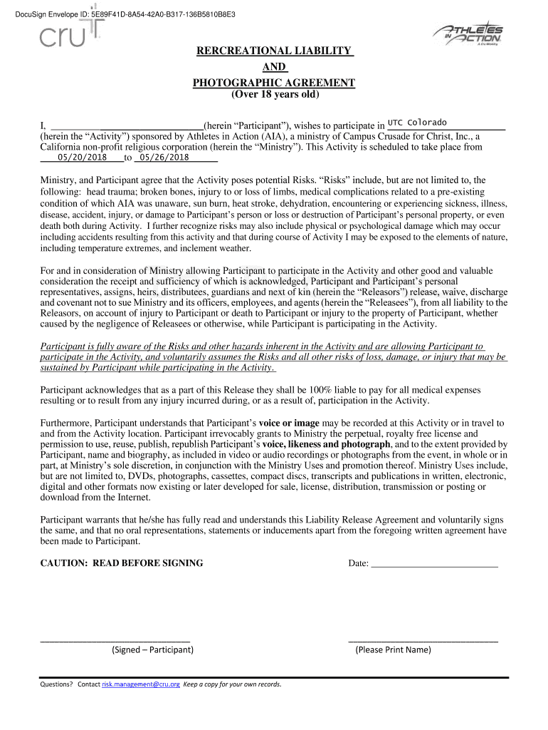 DocuSign Envelope ID: 5E89F41D8A5442A0B317136B5810B8E3RERCREATIONAL LIABILITY AND PHOTOGRAPHIC AGREEMENT (Over 18 years old) UTC Colorado I, (herein Participant), wishes to participate in (herein