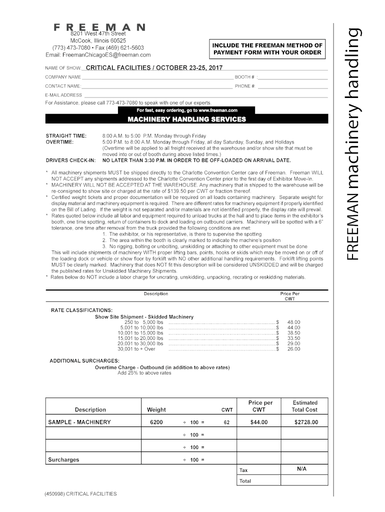 INCLUDE THE FREEMAN METHOD OF PAYMENT FORM WITH YOUR OVERCAME OF SHOW: CRITICAL FACILITIES / OCTOBER 2325, 2017 COMPANY NAME BOOTH # : CONTACT NAME: PHONE #: EMAIL ADDRESS For Assistance, please call