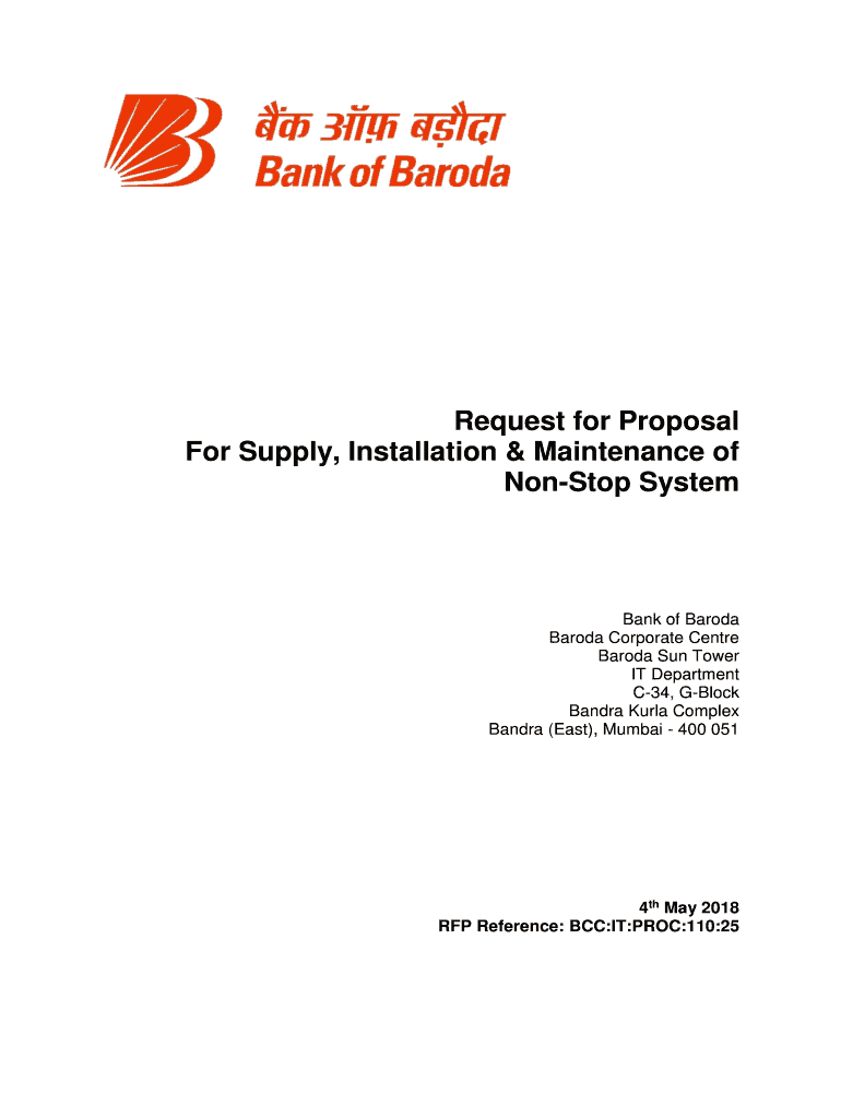 Request for Proposal For Supply, Installation & Maintenance of NonStop SystemBank of Baroda Corporate Center Baroda Sun Tower IT Department C34, Block Sandra Karla Complex Sandra (East), Mumbai 400