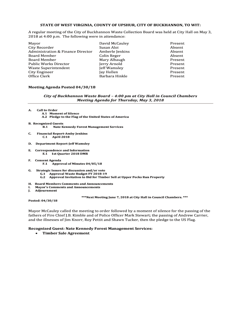 STATE OF WEST VIRGINIA, COUNTY OF USHER, CITY OF BUCHANAN, TO WIT: A regular meeting of the City of Buchanan Waste Collection Board was held at City Hall on May 3, 2018, at 4:00 p.m. The following