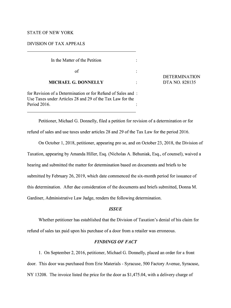 STATE OF NEW YORK DIVISION OF TAX APPEALS In the Matter of the Petition:of:MICHAEL G. DONNELLY:DETERMINATION DTA NO. 828135for Revision of a Determination or for Refund of Sales and : Use Taxes under