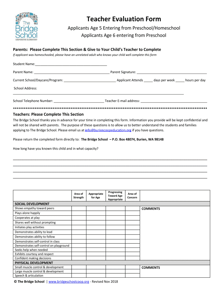 Teacher Evaluation Form Applicants Age 5 Entering from Preschool/Homeschool Applicants Age 6 entering from Preschool Parents: Please Complete This Section & Give to Your Child's Teacher to Complete