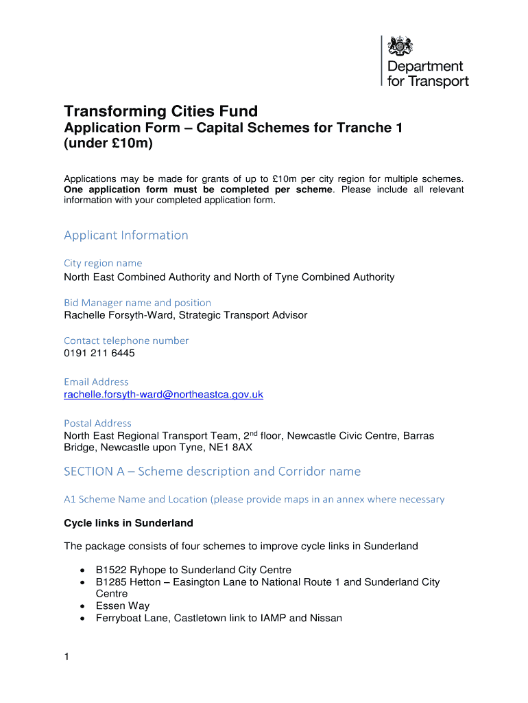 Transforming Cities Fund Application Form Capital Schemes for Tranche 1 (under 10 m) Applications may be made for grants of up to 10 m per city region for multiple schemes. One application form