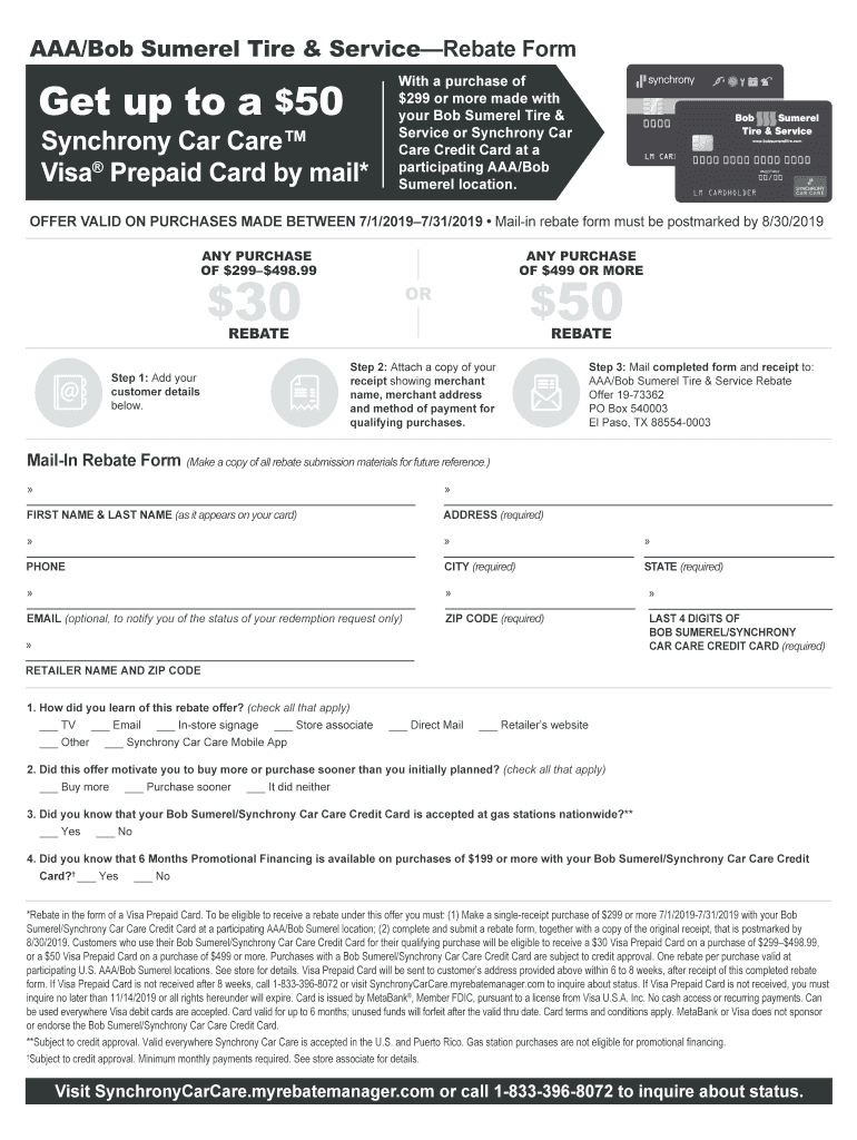 AAA/Bob Summary Tire & ServiceRebate Forget up to a $50Synchrony Car Care Visa Prepaid Card by mail×With a purchase of $299 or more made with your Bob Summary Tire & Service or Synchrony Car Care