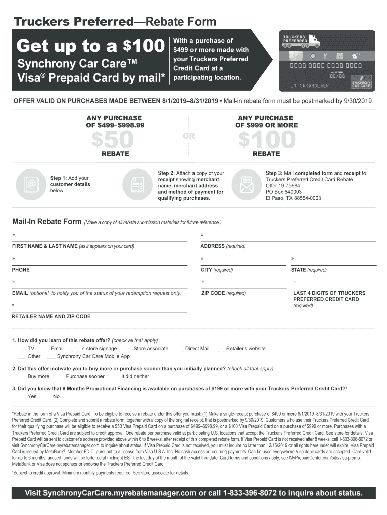 Truckers PreferredRebate Forget up to a $100Synchrony Car Care Visa Prepaid Card by mail×With a purchase of $499 or more made with your Truckers Preferred Credit Card at a participating location.