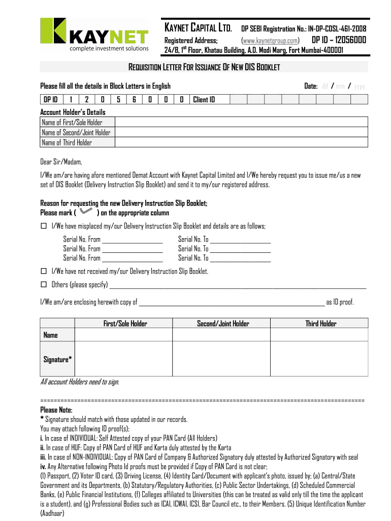 WAYNE CAPITAL LTD.DP SEMI Registration No.: INDPCDSL4612008 Registered Address; (www.kaynetgroup.com) DP ID 12056000 st 24/B, 1 Floor, Château Building, A.D. Mode Mary, Fort Mumbai400001REQUISITION
