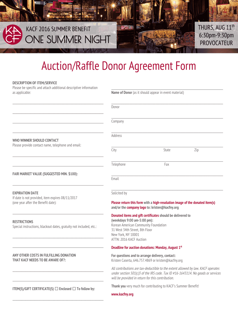 THURS, AUG 11th 6:30pm9:30pm PROVOCATEURKACF 2016 SUMMER BENEFIT ONE SUMMER NIGHTAuction/Raffle Donor Agreement Form DESCRIPTION OF ITEM/SERVICE Please be specific and attach additional descriptive