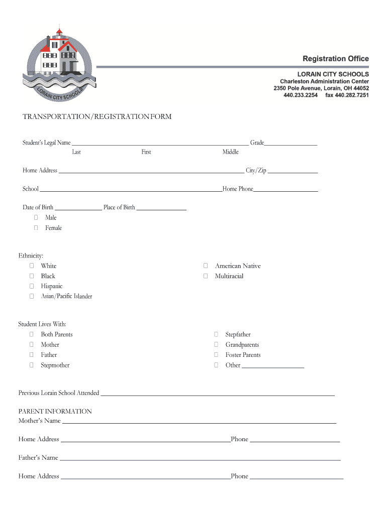 TRANSPORTATION/REGISTRATION FORM Students Legal Name Grade Last First Middle Home Address City/Zip School Home Phone Date of birthplace of Birth Male FemaleEthnicity: White Black Hispanic Asian/Pacific