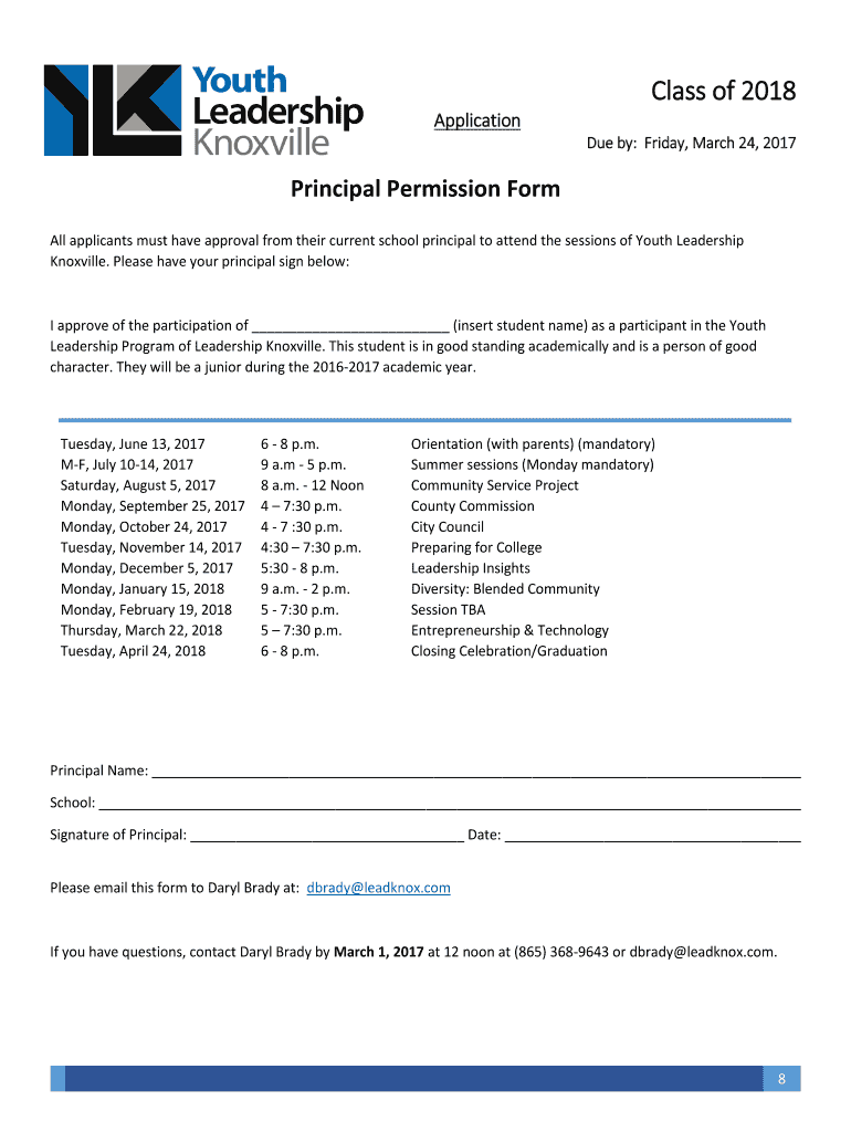 Class of 2018 Application Due by: Friday, March 24, 2017Principal Permission Form All applicants must have approval from their current school principal to attend the sessions of Youth Leadership Knoxville.