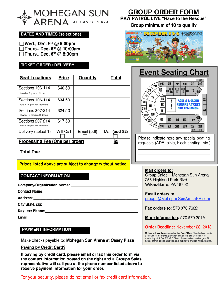GROUP ORDER FORM PAW PATROL LIVE Race to the Rescue Group minimum of 10 to qualify DATES AND TIMES (select one)Wed., Dec. 5th 6:00pm Thurs., Dec. 6th 10:00am Thurs., Dec. 6th 6:00pm TICKET ORDER /
