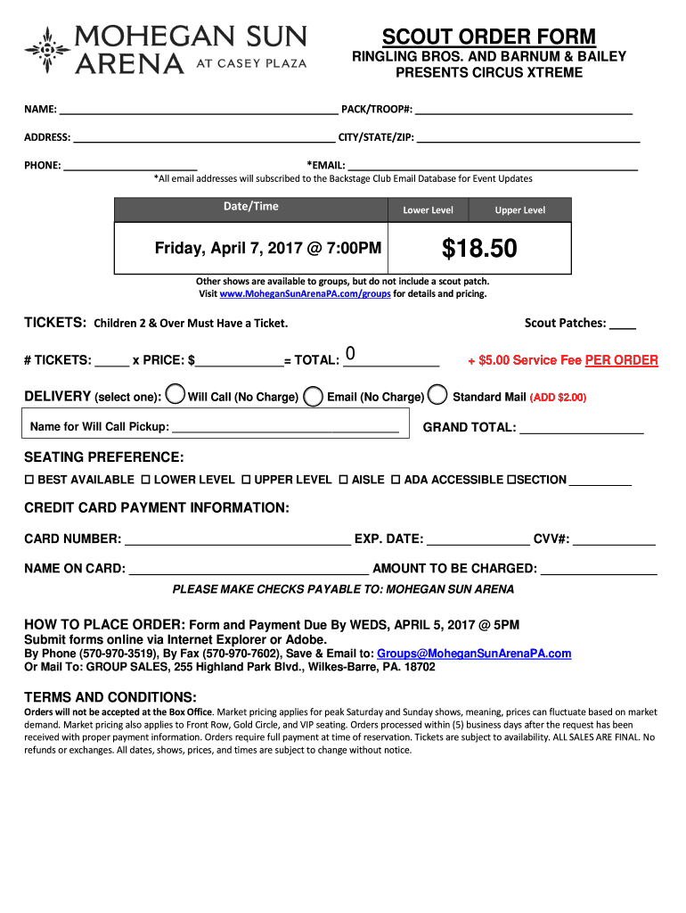 SCOUT ORDER FORM RINGLING BROS. AND BARNUM & BAILEY PRESENTS CIRCUS EXTREME NAME: PACK/TROOP#: ADDRESS: CITY/STATE/ZIP: PHONE: *EMAIL: *All email addresses will subscribed to the Backstage Club Email
