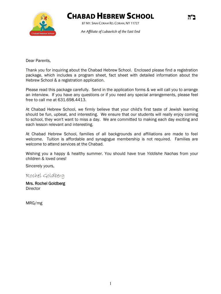 Dear Parents, Thank you for inquiring about the Chased Hebrew School. Enclosed please find a registration package, which includes a program sheet, fact sheet with detailed information about the Hebrew