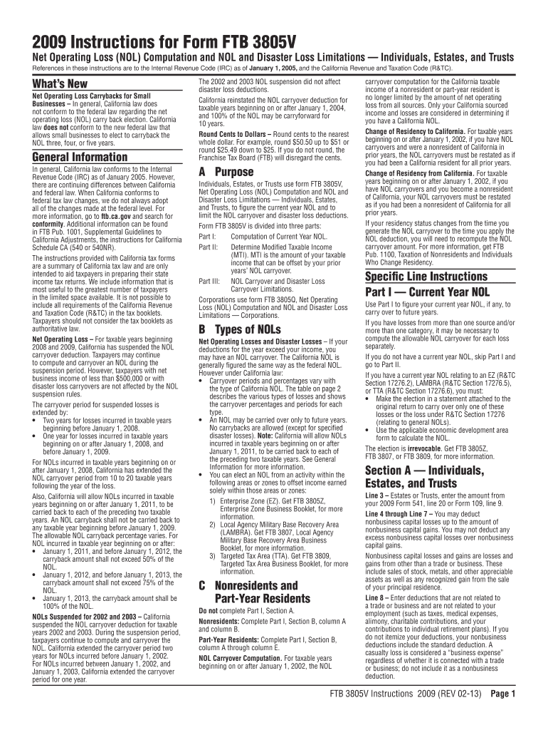 2009 Instructions for Form FT 3805VNet Operating Loss (NOT) Computation and NOT and Disaster Loss Limitations Individuals, Estates, and Trusts References in these instructions are to the Internal