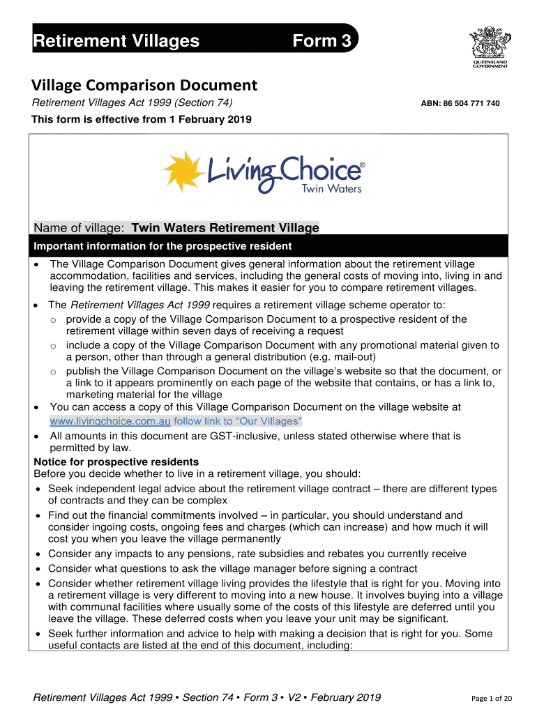 Retirement Villages Act 1999 (Section 74)ABN: 86 504 771 740This form is effective from 1 February 2019Name of village: Twin Waters Retirement