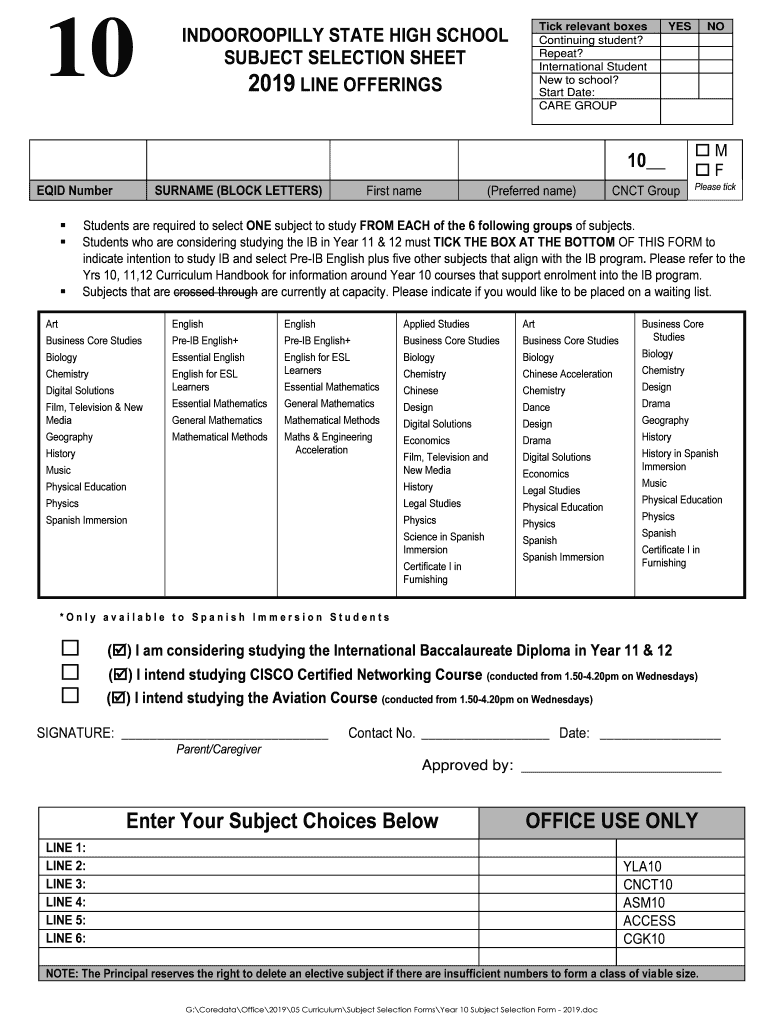 10Tick relevant boxes Continuing student? Repeat? International Student New to school? Start Date: CARE GROUPINDOOROOPILLY STATE HIGH SCHOOL SUBJECT SELECTION SHEET 2019 LINE OFFERINGSYES10 ENID Number