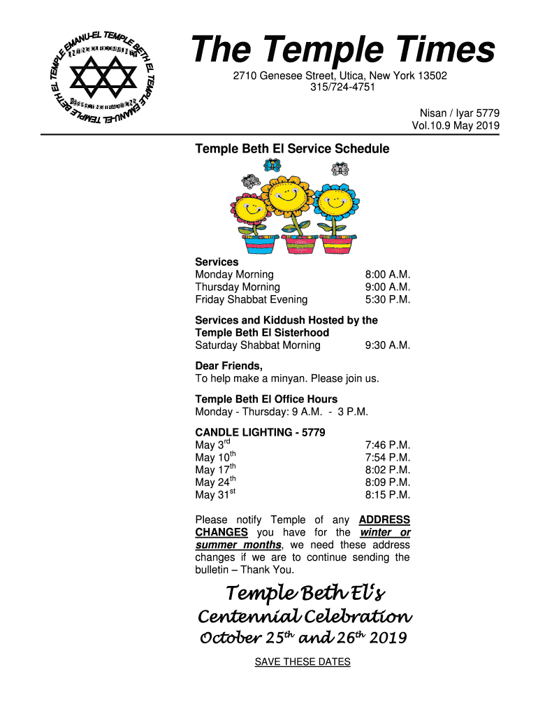 The Temple Times 2710 Geneses Street, Utica, New York 13502 315/7244751 Nisan / Iyar 5779 Vol.10.9 May 2019Temple Beth El Service ScheduleServices Monday Morning Thursday Morning Friday Shabbat Evening8:00