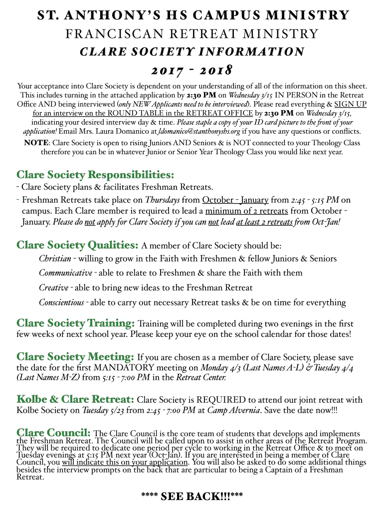 ST. A NTH ON S HS CAMP US MINISTRY FRANCISCAN RETREAT MINISTRY CL AR E SCI ET Y IN F O R M AT IO N2 017 2018 Your acceptance into Clare Society is dependent on your understanding of all the information