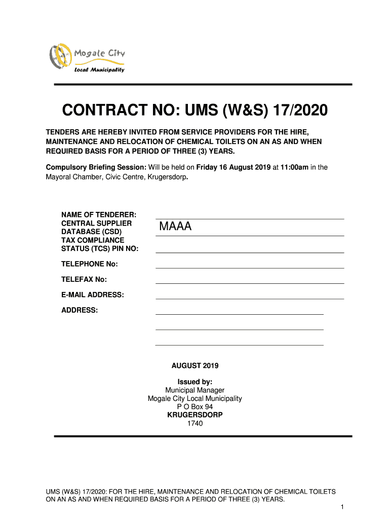 CONTRACT NO: UMS (W&S) 17/2020 TENDERS ARE HEREBY INVITED FROM SERVICE PROVIDERS FOR THE HIRE, MAINTENANCE AND RELOCATION OF CHEMICAL TOILETS ON AN AS AND WHEN REQUIRED BASIS FOR A PERIOD OF THREE