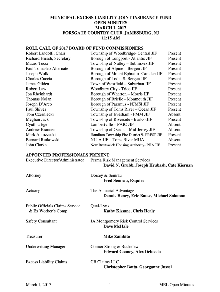 MUNICIPAL EXCESS LIABILITY JOINT INSURANCE FUND OPEN MINUTES MARCH 1, 2017, FRIGATE COUNTRY CLUB, AMESBURY, NJ 11:15 AM ROLL CALL OF 2017 BOARD OF FUND COMMISSIONERS Robert Randolph, Chair Township