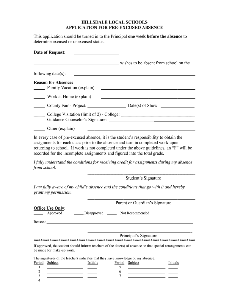 Get the free Pre-Excused Absence Form - Hillsdale Local School District