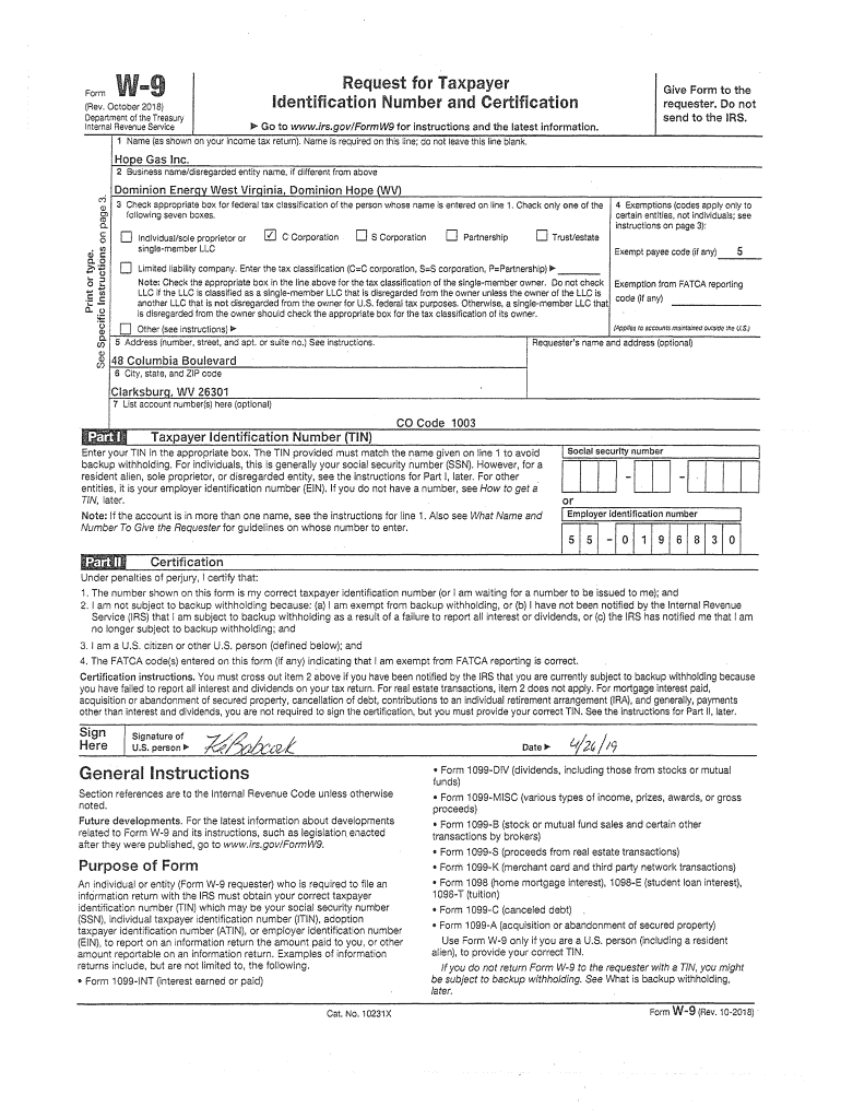 Get the free W9 Co Code 1003 Hope Gas Inc - Dominion Energy