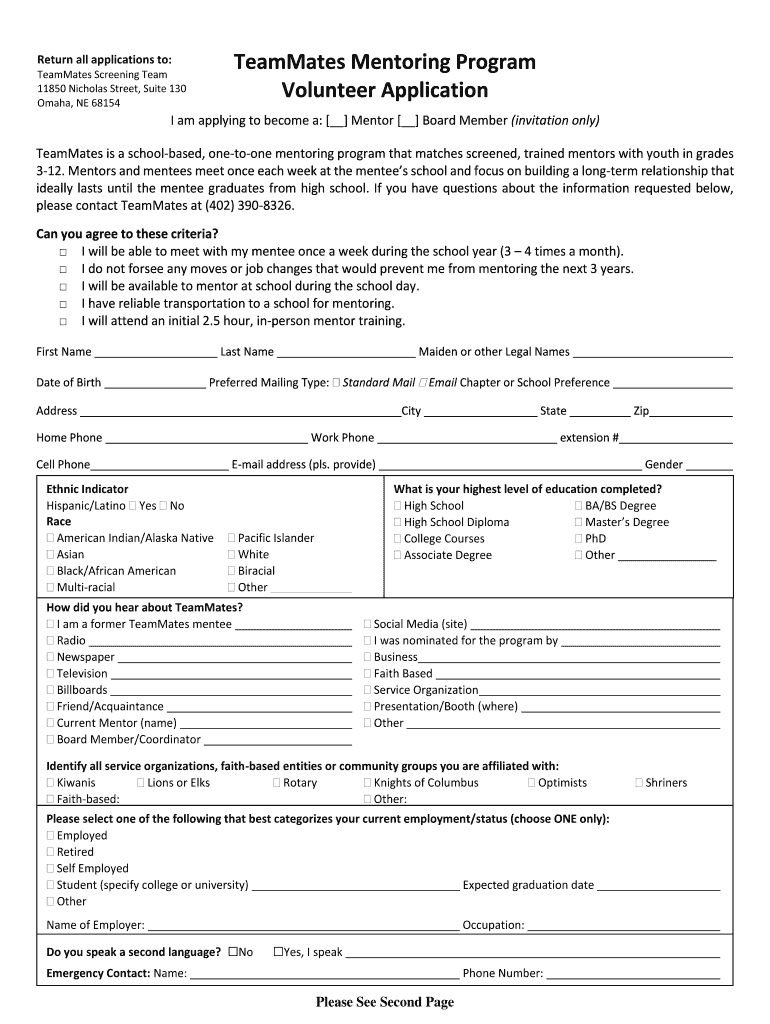 Teammates Mentoring Program Volunteer ApplicationReturn all applications to: Teammates Screening Team 11850 Nicholas Street, Suite 130 Omaha, NE 68154I am I applying to become a: Mentor Board Member
