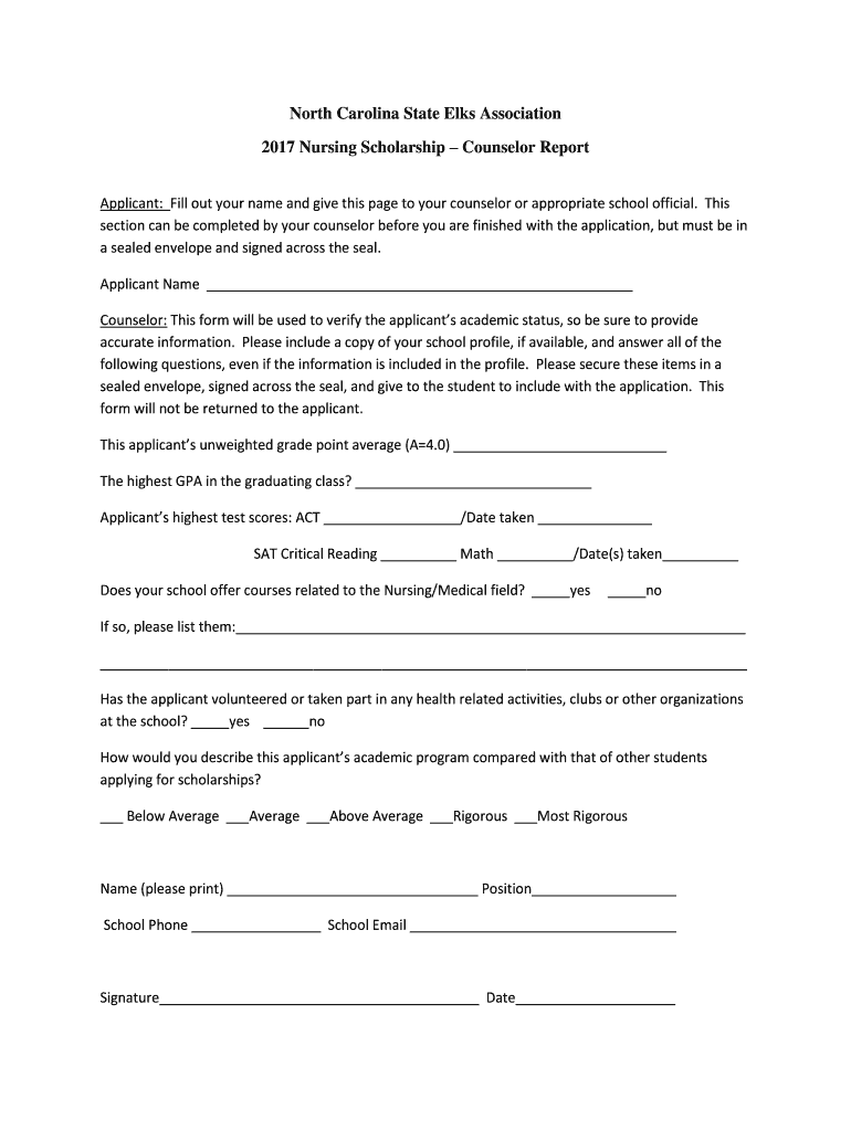 North Carolina State Elks Association 2017 Nursing Scholarship Counselor Report Applicant: Fill out your name and give this page to your counselor or appropriate school official. This section can