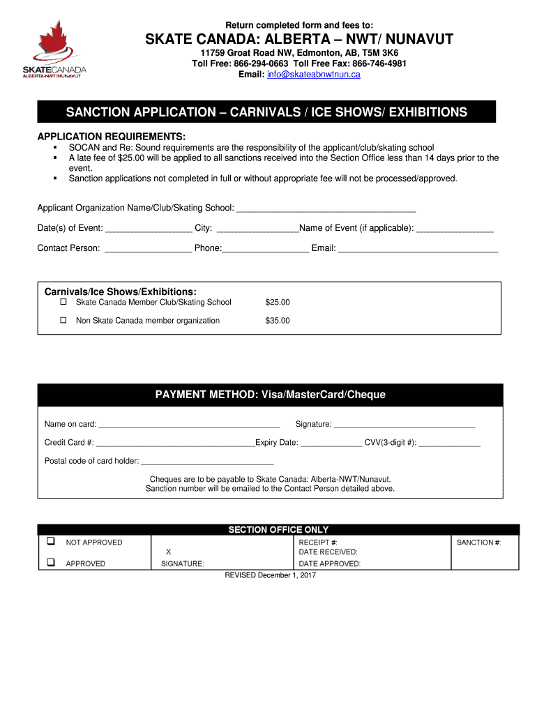Return completed form and fees to:SKATE CANADA: ALBERTA NWT/ NUNAVUT 11759 Groat Road NW, Edmonton, AB, T5M 3K6 Toll Free: 8662940663 Toll Free Fax: 8667464981 Email: info skateabnwtnun. Sanction