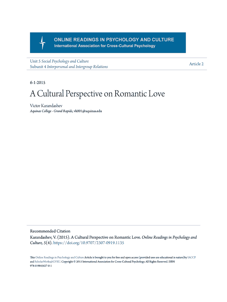 Unit 5 Social Psychology and Culture Subunit 4 Interpersonal and Intergroup RelationsArticle 2612015A Cultural Perspective on Romantic Love Victor Karandashev Aquinas College Grand Rapids, vk001 Aquinas.