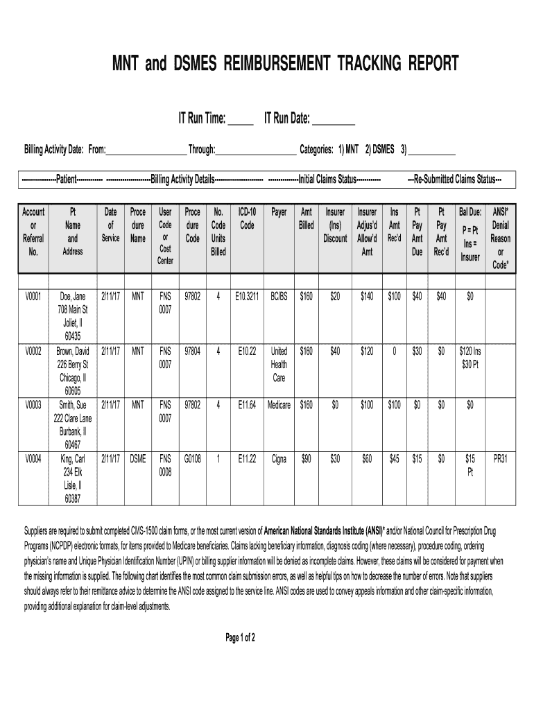 MNT and DOMES REIMBURSEMENT TRACKING REPORT IT Run Time: IT Run Date: Billing Activity Date: From: Through: Categories: 1) MNT 2) DOMES 3) Patient Billing Activity Details Initial Claims StatusAccount