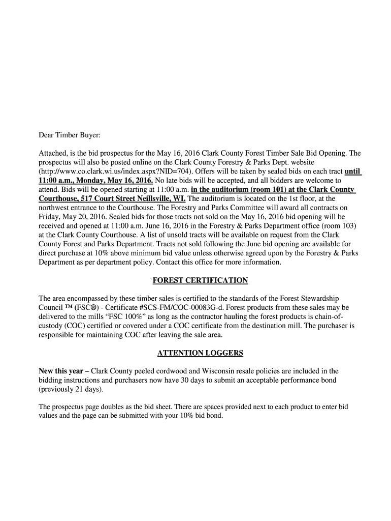 Dear Timber Buyer: Attached, is the bid prospectus for the May 16, 2016, Clark County Forest Timber Sale Bid Opening. The prospectus will also be posted online on the Clark County Forestry & Parks
