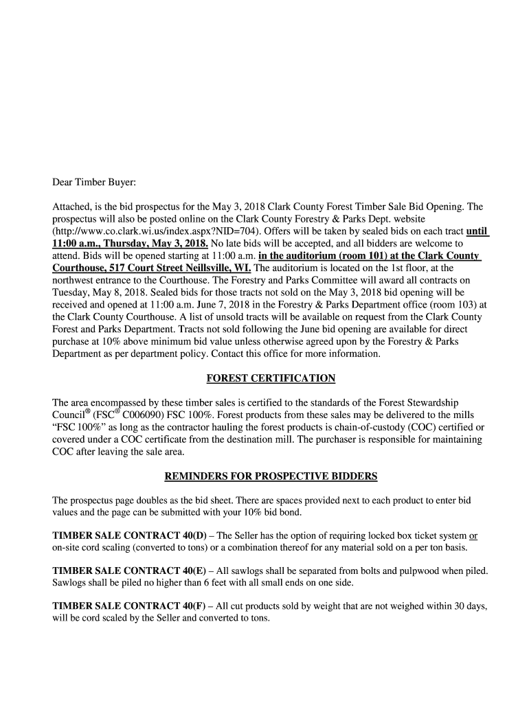 Dear Timber Buyer: Attached, is the bid prospectus for the May 3, 2018, Clark County Forest Timber Sale Bid Opening. The prospectus will also be posted online on the Clark County Forestry & Parks