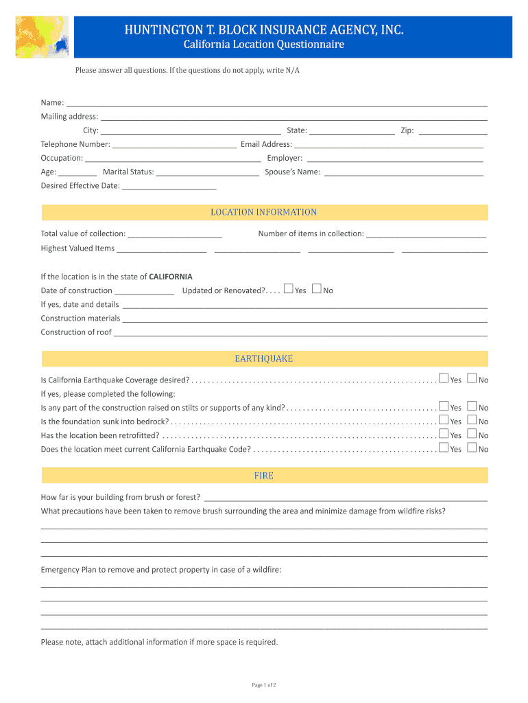 HUNTINGTON T. BLOCK INSURANCE AGENCY, INC. California Location QuestionnairePlease answer all questions. If the questions do not apply, write N/Name: Mailing address: City: State: Zip: Telephone Number: