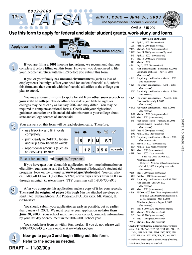 20022003TheFAFSAJuly 1, 2002 June 30, 2003, Free Application for Federal Student Aid OMB # 18450001Use this form to apply for federal and state* student grants, work study, and loans. STATE AID DEADLINESApply