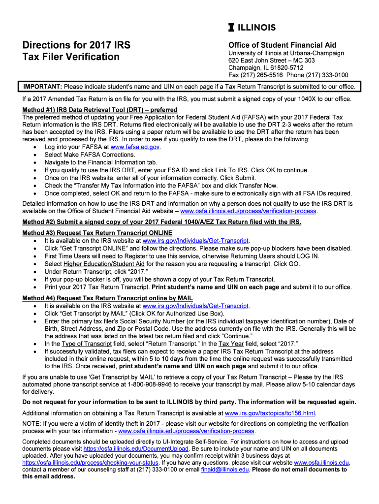 Directions for 2017 IRS Tax Filer VerificationOffice of Student Financial University of Illinois at UrbanaChampaign 620 East John Street MC 303 Champaign, IL 618205712 Fax (217) 2655516 Phone (217)