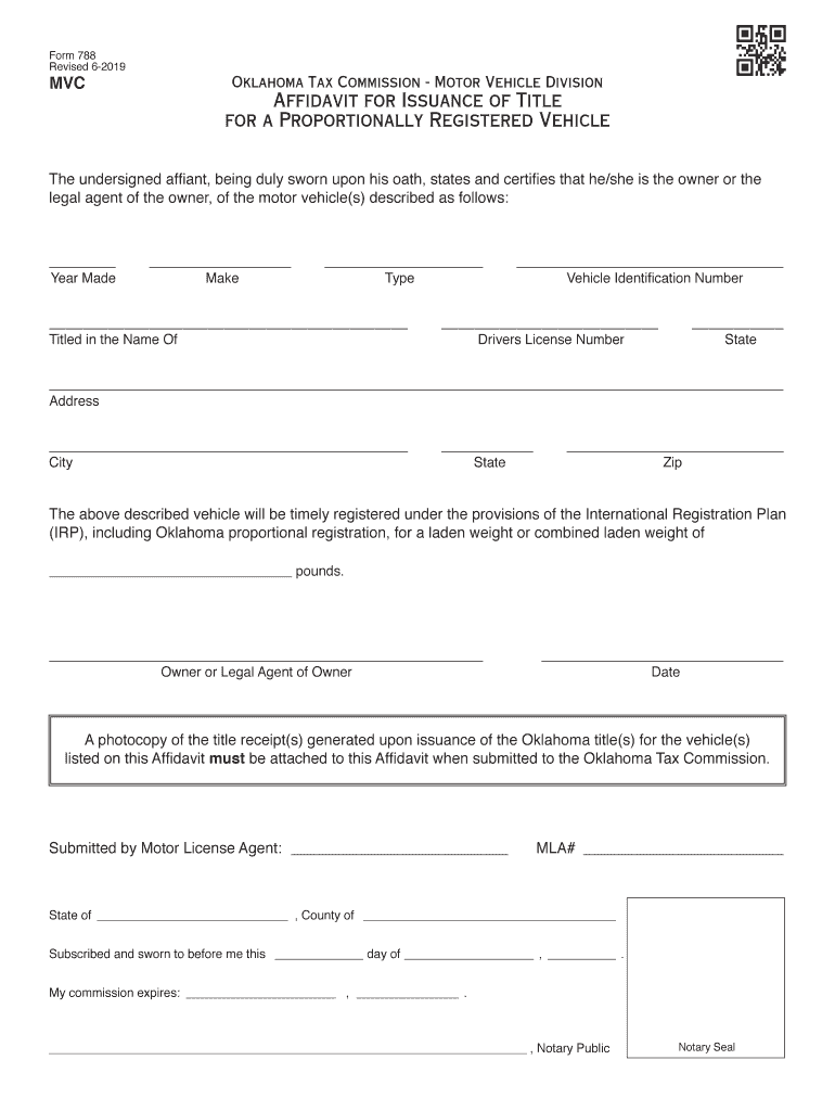 Form 788 Revised 62019MVCOklahoma Tax Commission Motor Vehicle DivisionAffidavit for Issuance of Title for a Proportionally Registered Vehicle undersigned affine, being duly sworn upon his oath, states