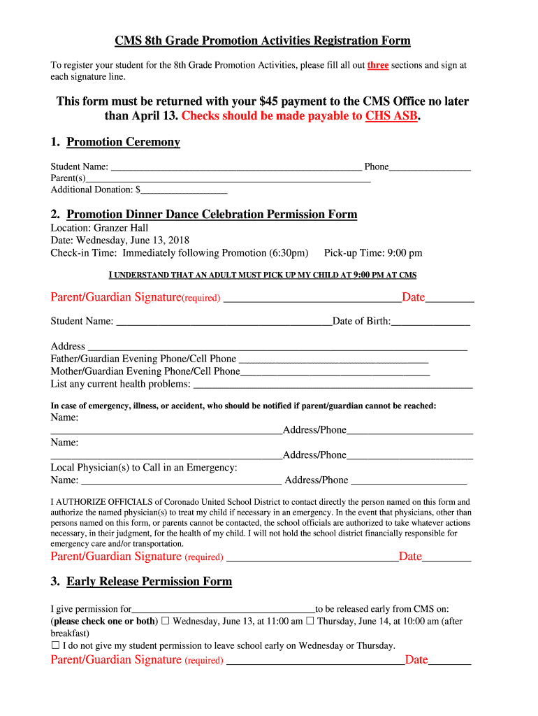 CMS 8th Grade Promotion Activities Registration Form To register your student for the 8th Grade Promotion Activities, please fill all out three sections and sign at each signature line. This form