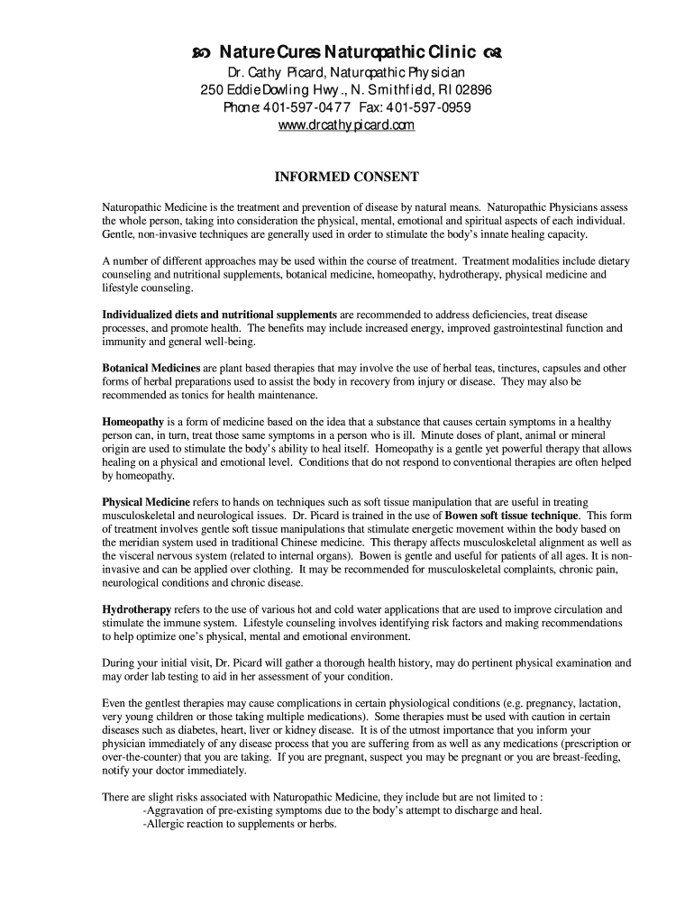 Nature Cures Naturopathic Clinic Dr. Cathy Picard, Naturopathic Physician 250 Eddie Dowling Hwy., N. Smithfield, RI 02896 Phone: 4015970477 Fax: 4015970959 www.drcathypicard.comINFORMED CONSENT Naturopathic